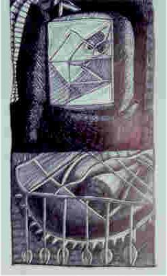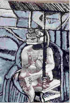 "Hombre recostado". Encre de chine sur bois